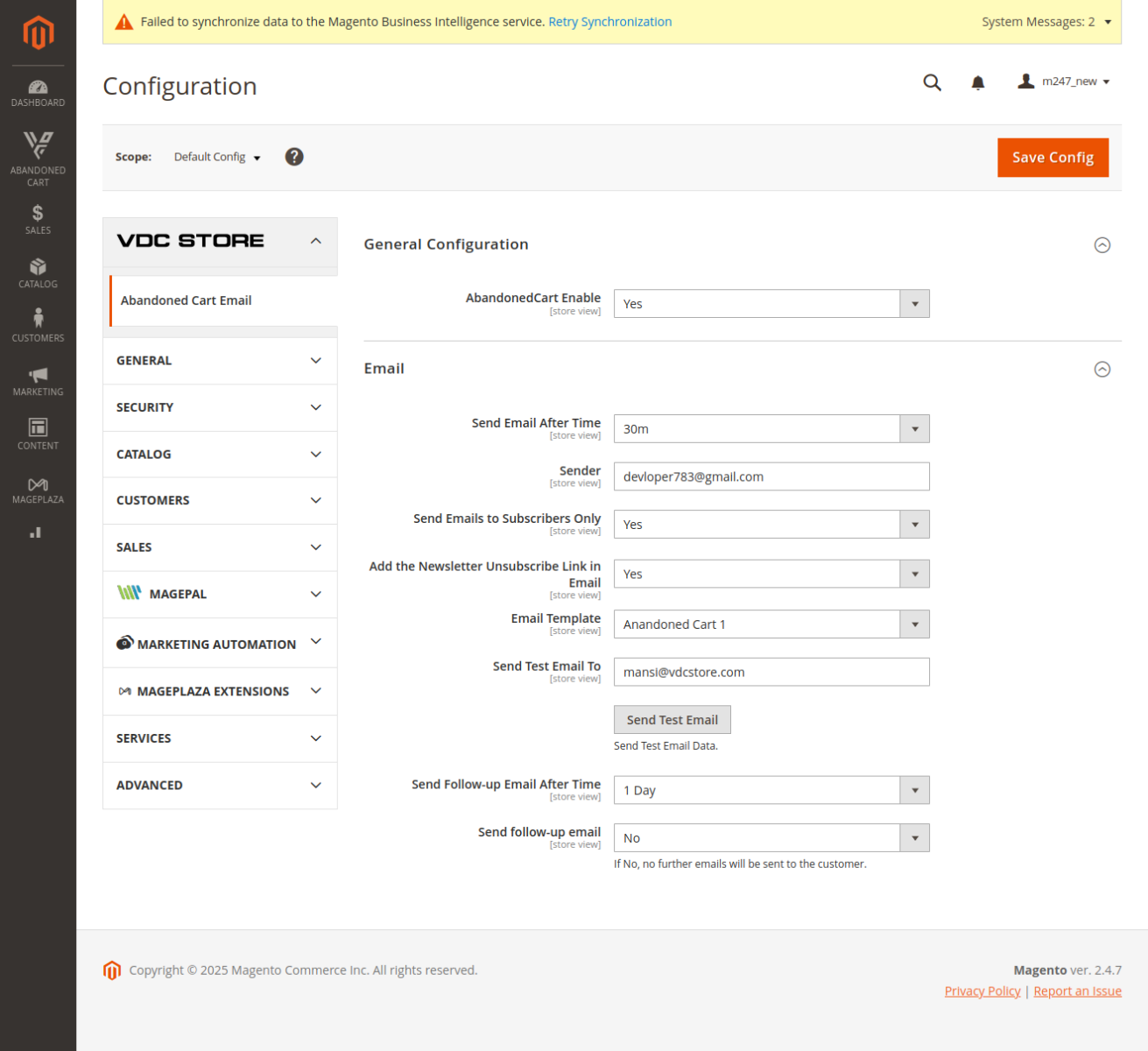 Admin Panel → Stores → Configuration → VDC Store → Abandoned Cart Email