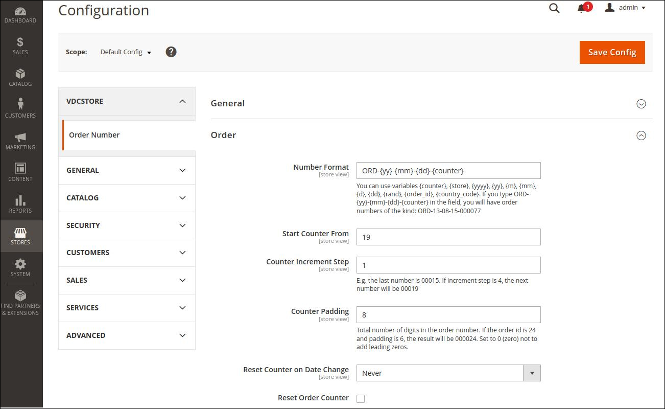 Go to Store > Configuration > Order Number and open the Order tab. Configure Number Format, Counter Increment Step, Counter Padding, and Reset Counter on Date Change. If required, set the exact Magento 2 order number or make a custom one in the Start Counter From field and Reset Order Counter.