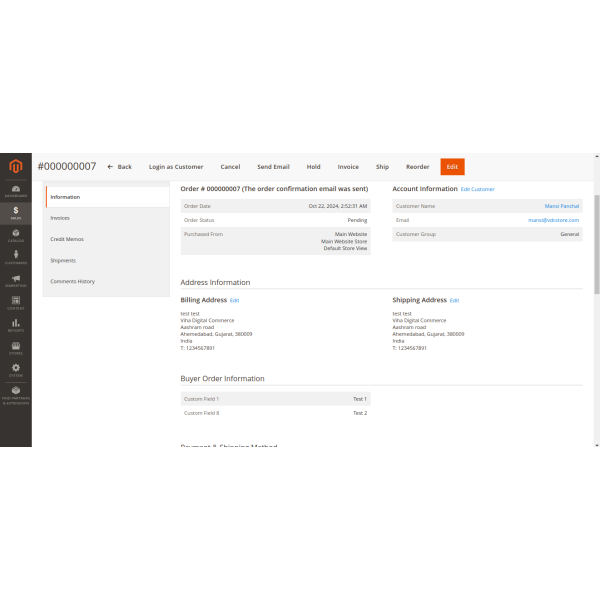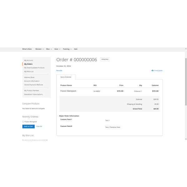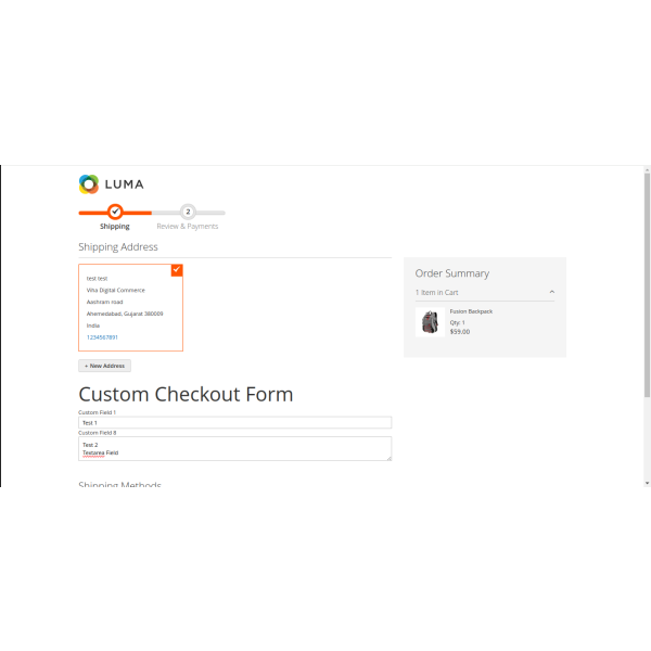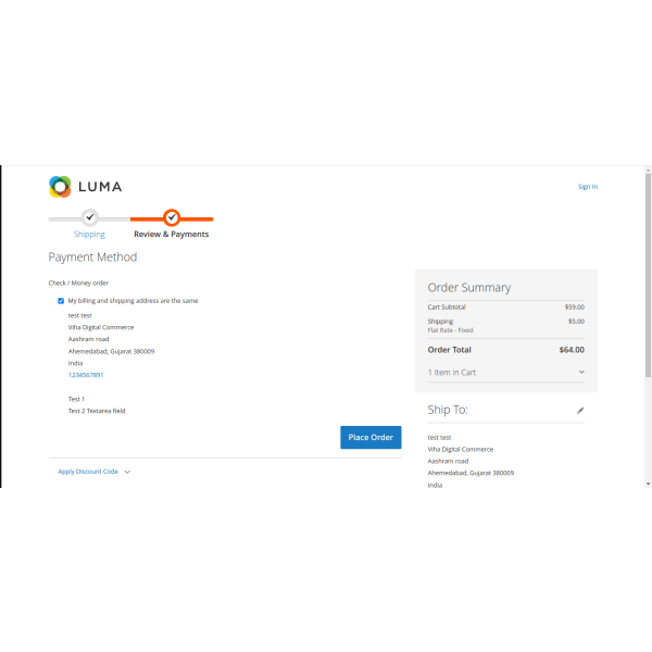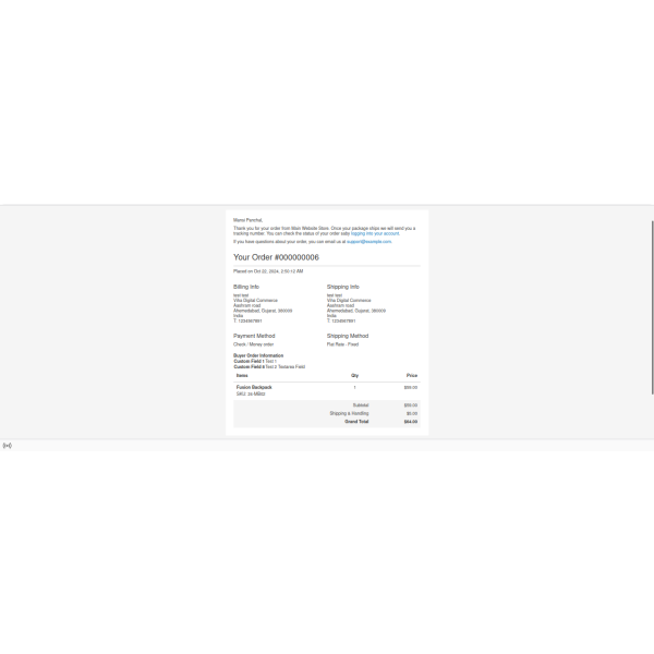 The data entered in the custom checkout fields will be displayed on the customer's Order View page. Additionally, it will appear in the admin's Order View, invoices, shipments, and credit memos, ensuring smooth order fulfillment and providing easy access to the information for order processing.