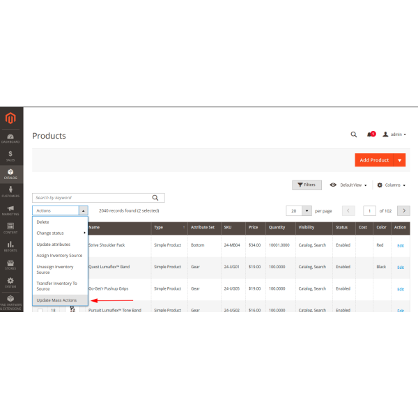 Mass Product Actions are enabled by default in Magento 2. To use them, go to the Catalog > Products section. From there, select the products you want to modify and use the mass action dropdown at the top of the product grid to select the desired action (e.g., delete, update status, apply a new price).