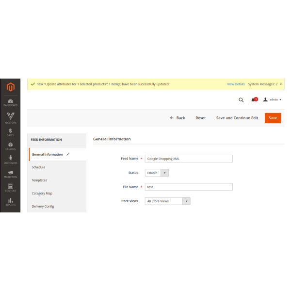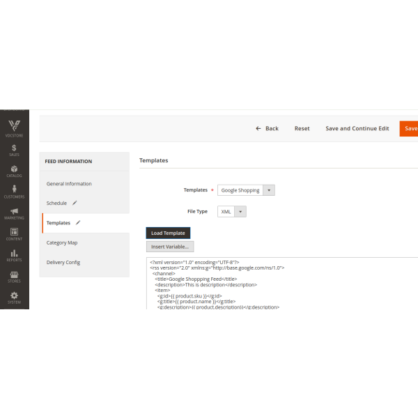 The Magento 2 Product Feed extension allows you to create custom feed templates that meet the requirements of various platforms, such as Google Shopping, Facebook, and more. You can filter products by categories, customize the feed format, and map product attributes to platform-specific fields, providing a flexible solution for exporting product data.