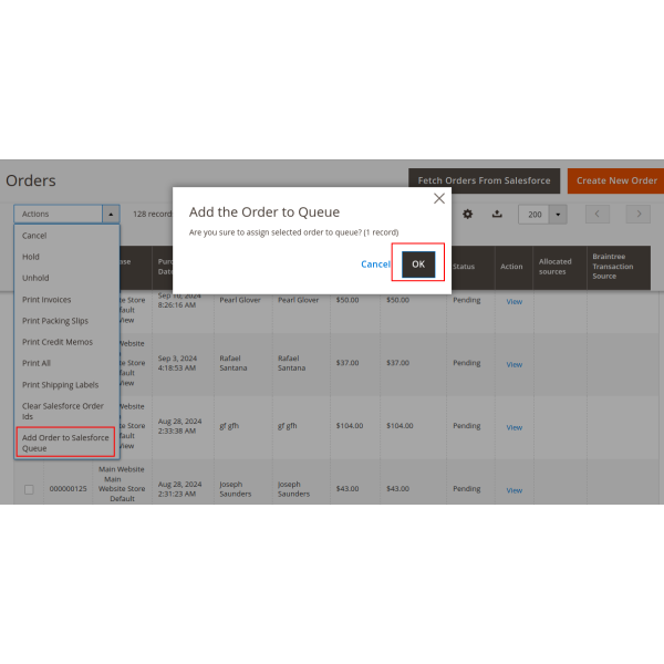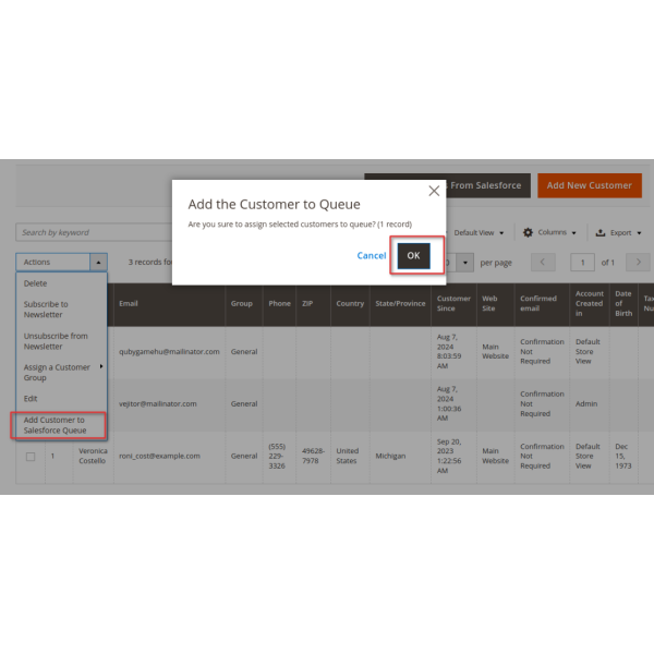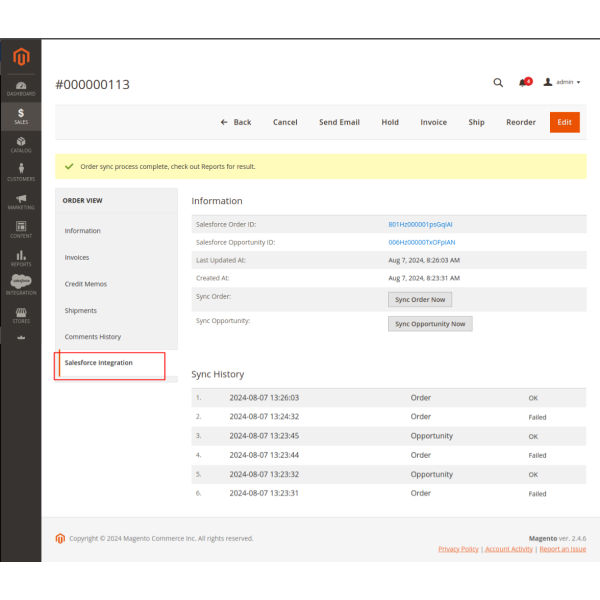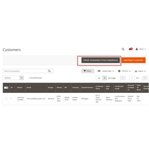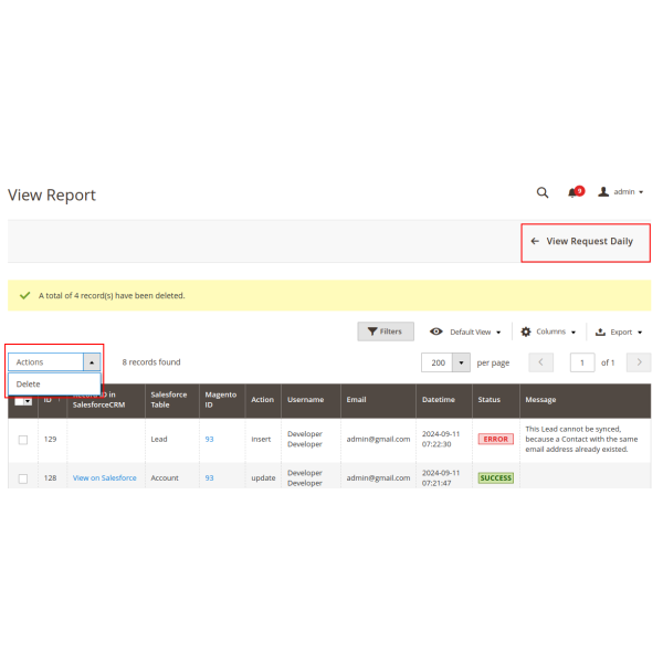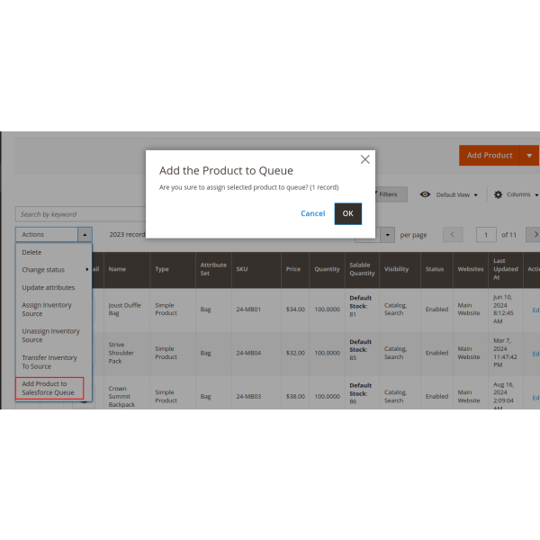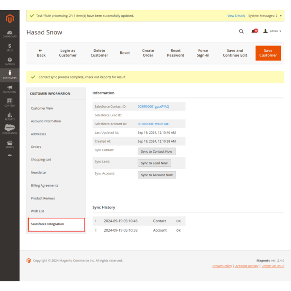 The Magento 2 Salesforce integration allows you to sync products, customers, and orders either manually or automatically. You can select specific items or sync all data, including products to Salesforce CRM, customers to Leads, Contacts, and Accounts, and orders to Salesforce Orders and Opportunities.